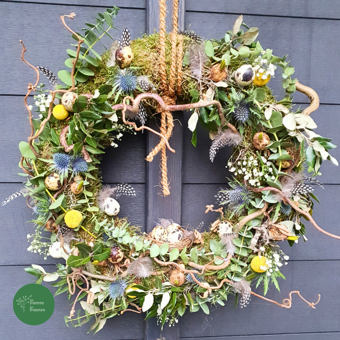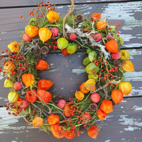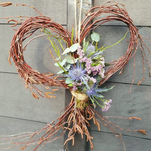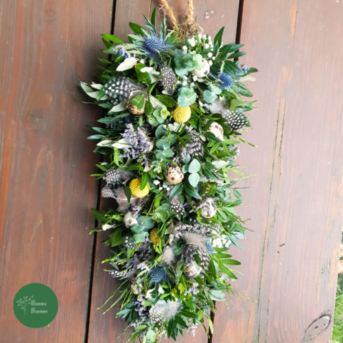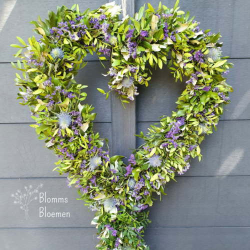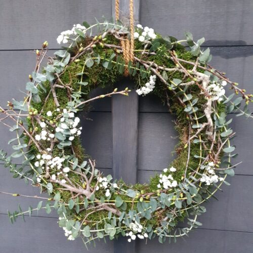 Met natuurlijke materialen die mooi indrogen zodat je er lang plezier van hebt. Denk aan een krans, toef of kruiktoef met mos, steeneik, eucalyptus, olijf, berk, bonsai, tijm, bosbes, distel en/of limonium. Gebonden op touw of strokrans. Ook zijn kransen op steekschuim met meer verse bloemsoorten mogelijk. Altijd aangevuld met verse materialen, kleuren en soorten die passen bij het seizoen.